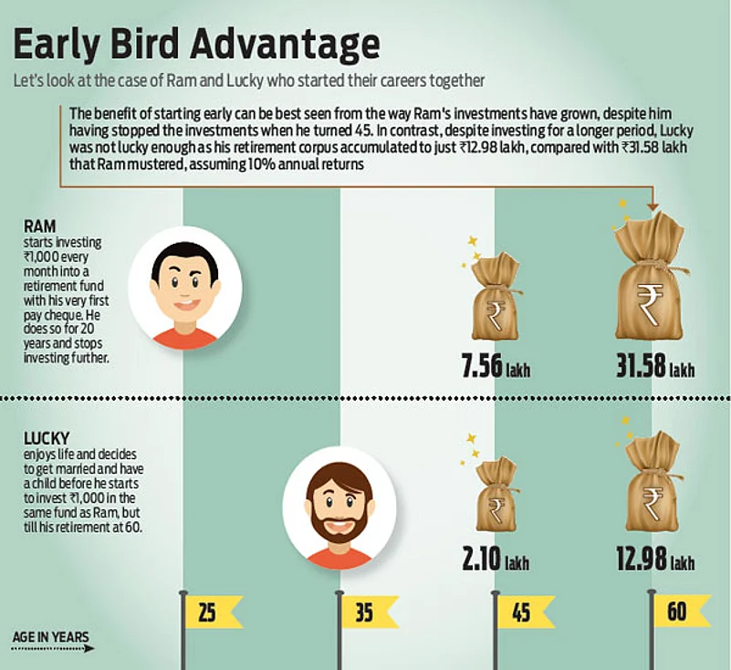 Like every other financial goal, there is a cost of delaying, which could be significant on how long you delay. Here’s an example. Two friends—Ram and Lucky—start working for the same company at age 25. During their first 10 years there, Ram saves Rs 1,000 a month through a retirement plan, while Lucky saves nothing. After 20 years, Ram stops contributing entirely. Meanwhile, after a decade of no savings, Lucky starts saving at age 35, saving that same Rs 1,000 a month. But unlike Ram, Lucky continues investing till he retires at 60. Ram has put only Rs 2.4 lakh into his account while Lucky has saved Rs3 lakh. But because Ram started sooner, he has Rs31.58 lakh in his account at retirement, versus only Rs12.98 lakh lakh for Lucky,assuming they both earn 10 per cent a year on their money (See: Early Bird Advantage). That’s the power of time and compounding.