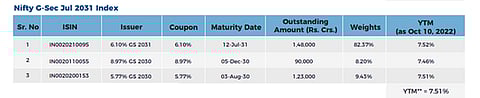 The fund will select the three most liquid G-Sec maturing in a 12-month period ending July 31, 2031. The selection will again be focused on the composite liquidity score based on the trades data available during the three-month period prior to June 15, 2022, with a minimum outstanding amount of Rs 25,000 crore as of June 15, 2022.