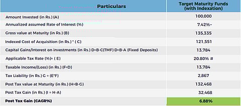 Unlike a fixed deposit, target maturity funds get indexation benefits on long-term capital gains tax if one sells these funds after three years. The indicative post-tax yield of HDFC G-Sec 2026 is a 6.88 per cent compound annual growth rate (CAGR).