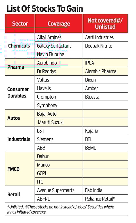 Lohchab says, “Sectors within our coverage, which could see tailwinds, include chemicals (Navin Fluorine, Alkyl Amines), Pharma (Aurobindo), Autos (Bajaj Auto, Maruti), Durables (Voltas, Havells), Cap goods/defence (L&T), E-Commerce (RIL). Outside our coverage sectors, he sees a range of potential beneficiaries across agrochemicals and fertilisers, solar panels, agri processing, plastics, auto components and steel products. “We recommend investors to closely watch developments in these sectors to see signs of improvement for multi-year investible themes. Consumption and financials might take a back seat as they would revive with a lag,” he concludes.