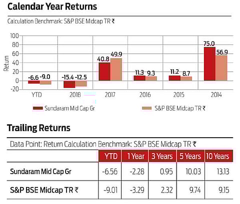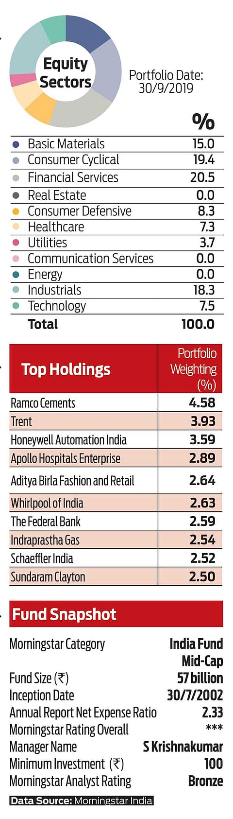 The fund is fairly diversified at a stock level, with top 10 holdings constituting around 30 per cent of the portfolio. Large-caps typically account for about 20 per centof the portfolio. The fund’s long-term orientation and the manager’s style of investing in high-conviction stocks could lead to a differentiated portfolio compared with peers as well as the index. However, the investment process should hold the fund in good stead.