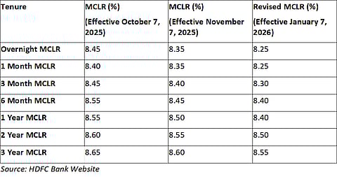 Effective January 7, 2026, HDFC Bank MCLR for overnight borrowing is fixed at 8.25 per cent, a 10 basis points down from the last revision. The reduction in MCLR ranged from 5 to 10 basis points across tenures.