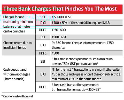 Apart from the above-mentioned charges, banks may levy fees and penalties under different situations. Some of these include cheque bounce, SMS service fees, account closure, outstation cheque handling charges, extra cheque book, demand drafts, reward point redemption, locker rent and PIN regeneration. At SBI, if a cheque is returned for insufficient funds, Rs500+ GST is levied as a fee irrespective of the amount. At ICICI bank, the charges are Rs350 for one cheque return per month and thereafter Rs750 for financial reasons and Rs50 for non-financial reasons.