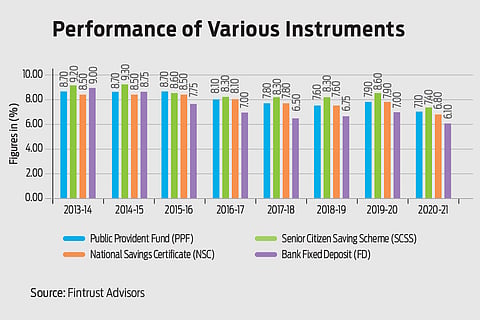 However, in recent times, the returns on these investments have been falling. Be it PPF, or Senior Citizens Savings Scheme (SCSS) or National Savings Certificate (NSC), the interest rates on all these schemes have fallen by around 1-2 per cent over the last five years or so. PPF used to give a return of 8.7 per cent in 2014-15, which has now come down to 7.1 per cent, whereas NSC’s rate of return has dropped to 6.8 per cent during this period. SCSS interest rate during this time has fallen dramatically from 9.3 per cent to 7.4 per cent.