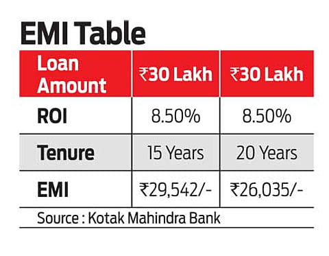 Typically, the EMI amount for a home loan should not exceed 40 per cent of one’s monthly disposable income. Once the EMI is established, one needs to calculate the minimum tenure required to repay the loan. The tenure for a home loan usually runs for 15-20 years. If a customer receives some bullet inflows that enables him/her to prepay, one should reset the tenure because longer the tenure, higher is the total outlay. For guidance, one can refer to the EMI table. This illustration assumes an interest rate of 8.5 per cent on a Rs30 lakh loan for a 15 and 20-year tenure and shows EMI payable per month.