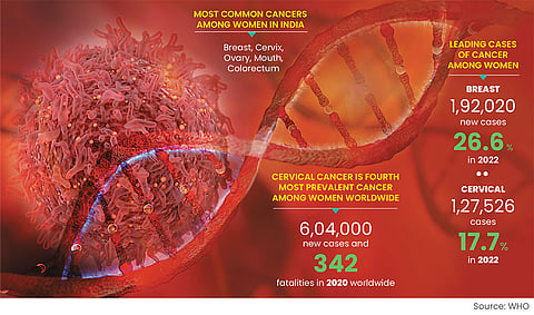 Data around another type of cancer that is common among women—breast cancer—is equally scary. Breast cancer was the leading cancer among women with as many as 192,020 new cases (26.6 per cent), followed by 127,526 cases of cervical cancer (17.7 per cent) recorded in 2022, according to data from the WHO.