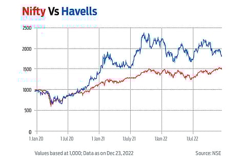 Havells has reported strong revenue, earning a CAGR of 14-15 per cent over FY12-22, with double-digit Ebitda margin of 11-13 per cent. However, its recent performance in Q2FY23, was negatively impacted by high-cost inventory, leading to a fall in gross margin. In addition, advertisement expenses climbed back to pre-Covid levels that led to Ebitda margin falling to a multi-year low at 7.8 per cent.