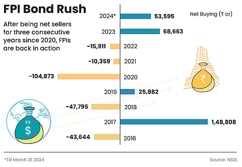 Since the announcement of this inclusion, FPIs have been pouring money into the Indian bond market. After being net sellers in three consecutive years—2020, 2021 and 2022—FPIs bought Rs 68,663 crore worth of bonds in 2023 (see FPI Bond Rush).
