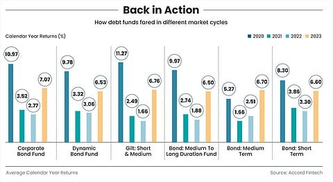 For instance, dynamic bond fund, which manages its portfolio dynamically according to the varied interest rate scenario, posted average returns of 3.32 and 3.067 per cent in 2021 and 2022, respectively. Likewise, corporate bond funds, one of the largest categories in terms of assets under management (AUM) of Rs 1.46 trillion as of February 2024, posted abysmal returns during the same period. The category average return was 3.52 and 2.77 per cent, respectively, in 2021 and 2022.