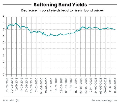 With the possibility of interest rate cuts imminent, taking a medium- to long-term bet on debt schemes is a smart move, which is likely to pay off handsomely in the future. For instance, the yield on a 10-year government bond is 7.096 per cent now (see Softening Bond Yields) and has been falling steadily over the past six months—from 7.432 per cent in October 2023 to the current levels—and the prices are becoming more attractive. This might give a fillip to debt mutual funds. For investors, this situation augurs well because bond yields and interest rates are positively correlated, with both moving in the same direction.