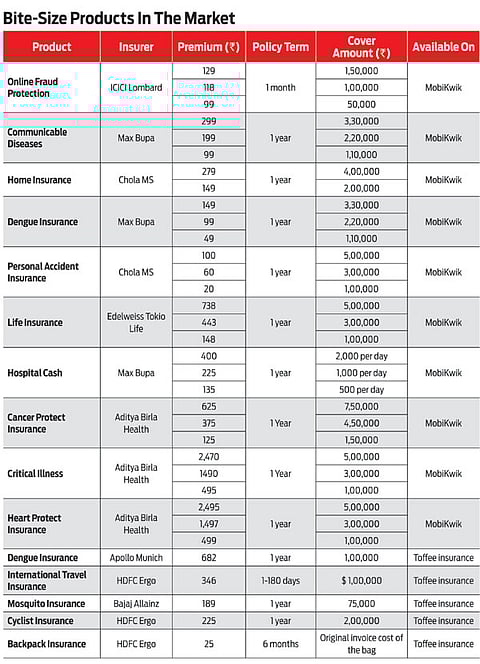 Toffee Insurance through its online portal offers bite-size plans. Another platform MobiKwik, a digital wallet company, in association with insurers like ICICI Lombard General Insurance, Max Bupa Health Insurance, Aditya Birla Health Insurance, Chola MS General Insurance, Edelweiss Tokio Life Insurance and ICICI Prudential Life insurance, offers bite-size plans with zero paperwork. Toffee Insurance has Apollo Munich, HDFC Ergo General Insurance, ICICI Prudential Life Insurance, IndiaFirst Life Insurance, ManipalCigna Health Insurance, Tata AIG General Insurance and Religare Health Insurance as partners to provide tailor-made products.