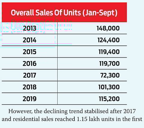 However, the declining trend stabilised after 2017 and residential sales reached 1.15 lakh units in the first nine months of 2019. The recovery has been gradual and the quantum of sales remains tad below the 2016 (pre-demonetisation) levels.