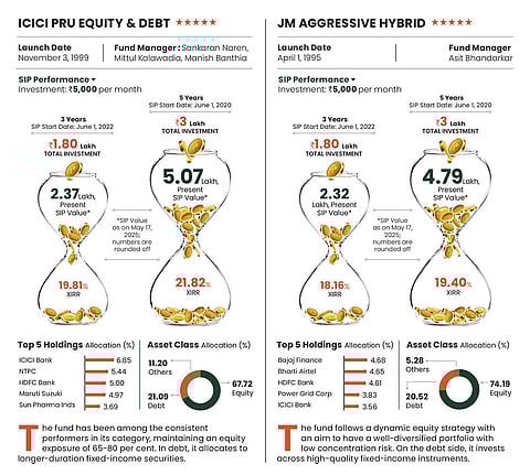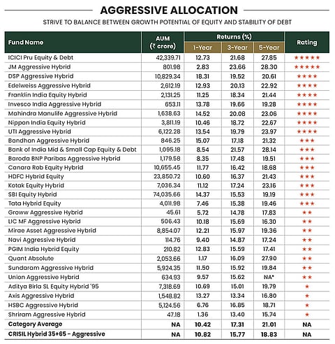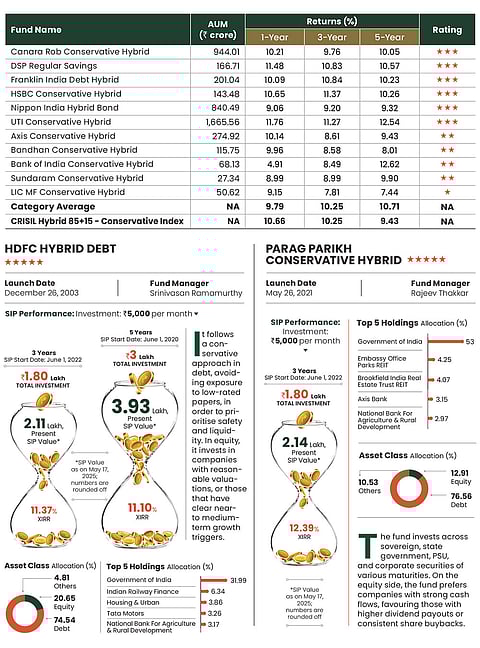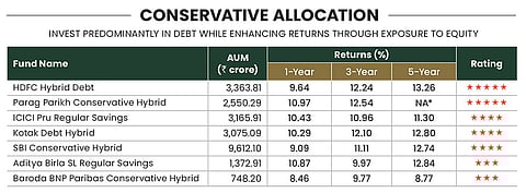 More than half of equity-oriented hybrid funds managed to beat the Crisil Hybrid 35+65–Aggressive index. Some of the funds with higher equity exposure in the mid- and small-cap space delivered higher returns compared to peers who chose to remain conservative. Typically, in a rising market, equity allocation boosts returns. So, funds with higher mid- and small-cap exposure secured top positions in the category in the last one year. The divergence in debt-oriented hybrid funds was relatively lower at around 7 per cent between the top and bottom performers.