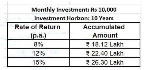 10 years is a long time period to change your financial status completely, provided you discipline yourself, stick to the strategy and invest in the right products. There are three major things that will decide how much money you will make in a particular time period, say 10 years. Let's take a look at them one by one.