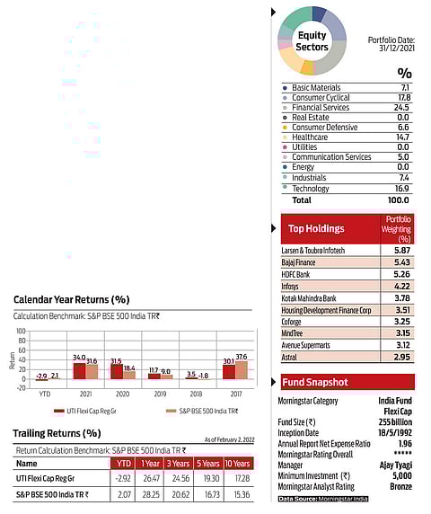 UTI Flexi Cap (erstwhile UTI Equity), launched in 1992, is one of the oldest funds in the Indian mutual fund industry. Fund manager Ajay Tyagi has worked for the company for more than two decades. He is backed by a large and a stable equity team that has nine portfolio managers and nine analysts (including the head of research).