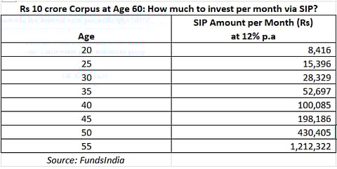Look at the numbers. If you invest through a systematic investment plan (SIP) and earn around 12 per cent a year over the long term, the monthly amount needed to reach Rs 10 crore by age 60 changes sharply with your starting age.