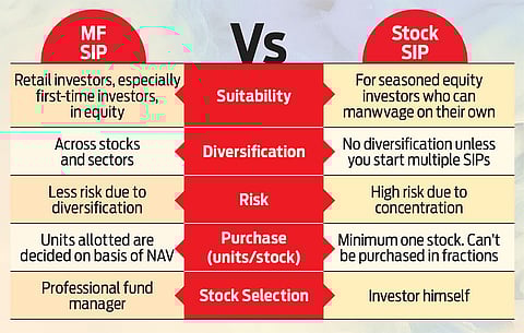 Stock SIPs can be highly risky for the amateur investor, who may be better off with a mutual fund SIP, though selection of the right mutual fund is equally important.