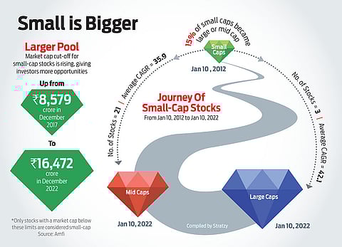 With the small-cap universe expanding and accommodating several larger companies than before, investors have more opportunities in the space now. Sample this: the market capitalisation cut-off for small-cap stocks is up from Rs 8,579 crore in December 2017 to Rs 16,472 crore in December 2022, according to data from the Association of Mutual Funds in India (Amfi). What this means is that the large- and mid-cap categories, which comprise relatively more stable companies, are pushing out companies that are, now occupying the top layer of the small-cap pie.