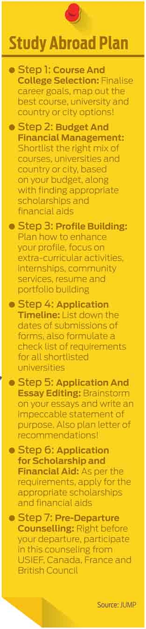 Students planning to study abroad and their parents should tick off the following boxes. It begins with identifying a course, then the university, the funding, visa process, and application. (See chart) However, funding still remains a major concern. Shrey Bharadwaj, of Meerut, had to struggle for funding when he got admission in Business Finance in WHU – Otto Beisheim School of Management, Germany. A leading private bank in India had assured to fund the `35 lakh educational loan but after he had submitted all documents, it backed out without citing any reasons and that too, just two days before he was to apply for visa. But luckily Oriental Bank of Commerce responded to his plea and issued the amount.