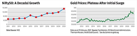 The stock market has a theoretically inverse correlation with the gold prices. When markets around the world went into a deep recession and stock prices hit their nadir last year, the yellow metal looked brighter and, with the markets regaining momentum after the COVID scare began ebbing out, there was a price correction in gold. The metal crossed the Rs 55,000-per-10-gram mark around mid-2020 and it fell below Rs 50,000 towards the end of the year and stayed there. Silver, which matched steps with the yellow metal in price surge, kept up the rally. The spot market price for the white metal reached Rs 68,535 per kilogram, climbing 62 per cent from Rs 42,425 per kilogram in the same period last year.
