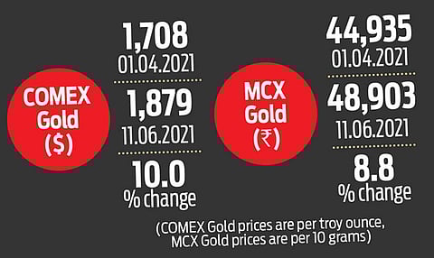 The revival trend seen in most major global economies had initially stolen the glint off gold. The yellow metal slumped to $1,675 in international markets with investors regaining their risk appetite and stepping out of the safe haven. But the gold prices rebounded quickly to trade a shade below the recent highs. The prices soared past $1,900 per ounce in the first five months of 2021 and gained roughly $197 per ounce, or 11.55 per cent, in the last two months.