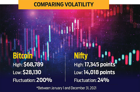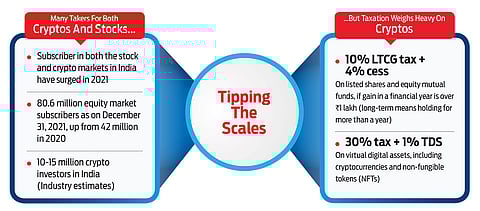 The government seems to have put its weight behind equities in the tug of war—being played out in the minds of investors, especially the Gen-Z and the younger millennial generations—between the two riskiest assets, equities and cryptos. The Union Budget 2022 introduced a steep tax rate of 30 per cent on virtual digital assets, including cryptocurrencies and non-fungible tokens (NFTs), while giving a slight relief on long-term capital gains (LTCG) tax levied on unlisted equities; for listed securities, the LTCG tax rate is 10 per cent, subject to conditions.