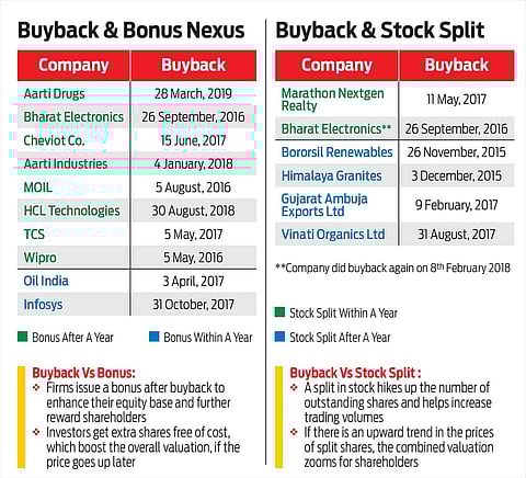 Over the past few months, buyback of shares by companies with surplus funds was back in fashion. Recently, a few firms resorted to it. At the time of writing, another six, including TCS, NTPC and NMDC, were in the various stages of the process. A single change in the last Budget made them fairly attractive, both for the companies and investors, compared to payment of high dividends. Apart from bonus issues, buybacks and dividends are ways in which firms reward their shareholders.