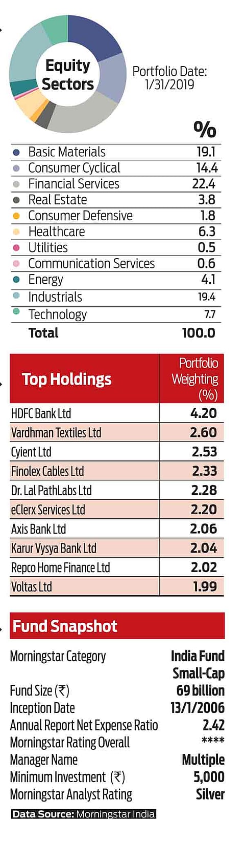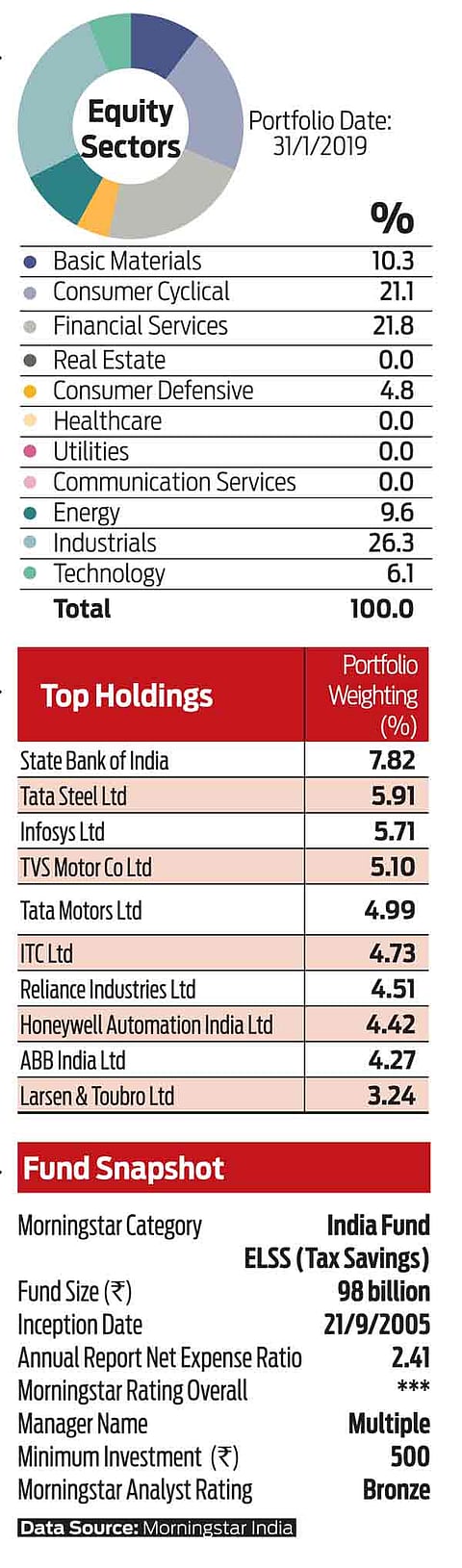 Manager Ashwani Kumar is an experience fund manager and is supported by a strong team. Kumar invests across market cap segments based on valuations. Further, he runs a concentrated portfolio and can tend to invest in slightly less-liquid stocks, given the three-year lock-in period. Kumar seeks to invest in companies with strong growth prospects that he believes are trading at a discount to their intrinsic value. In effect, he attempts to balance both growth and valuation aspects while investing.