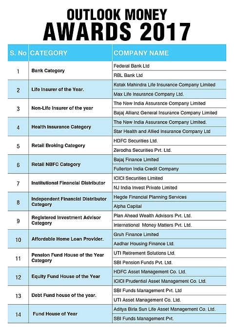 CARE Ratings devised the methodology to assess the applicants. The process and the findings were evaluated by an independent jury, which comprised Mr. Shaktikanta Das, former economic affairs secretary and currently member finance commission and Sherpa to the G20, Mr. Prashant Saran, former whole time member,SEBI, Mr. Rajesh Mokashi, MD,CARE Ratings, Mr. Sandeep Ghose, Director, NISM and Mr. Shailesh Haribhakti, Chairman Haribhakti Group. Outlook Money believes that excellence is to be celebrated. This is the underlying reason for choosing to recognize two top players in each category because sometimes it is not only about size or scale but also about the value proposition and innovations.