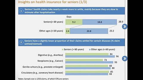 According to the survey, the health claims of senior citizens are usually settled one week later than those below 60 years of age. One possible reason is that they take more time to inform insurance companies about their illness and treatment post hospitalisations.