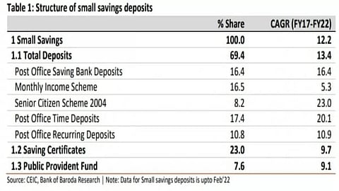 Data from the Bank of Baroda (BoB) showed that saving certificates formed the largest share of small savings deposits, while Public Provident Fund (PPF) had the lowest share at 7.6 per cent share.