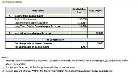 Debt mutual funds are taxed irrespective of a person’s age. However, there is an indexation benefit that adjusts gains with inflation, if long-term capital gains tax is applied. CA Abhishek Y. Bhavsar, a practising chartered accountant in Ahmedabad, explains the treatment of taxation of debt funds and fixed deposits with an illustration. Assumptions made- both debt mutual fund and FD bought on April 2018 and sold on March 2022, FD had 8 per cent per annum interest and the senior citizen has an income above Rs 10 lac.