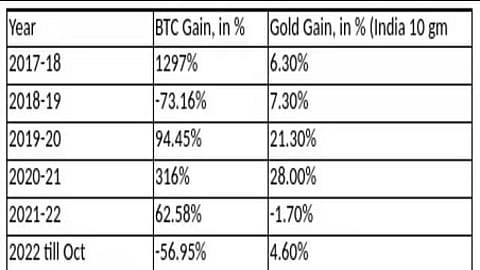 Around this time last year, a comparison between Bitcoin and gold arose, with returns from the former beating those from the yellow metal for a few consecutive years. But this year, gold returns have beaten Bitcoin hands down, according to data from Augmont goldtech pvt ltd.