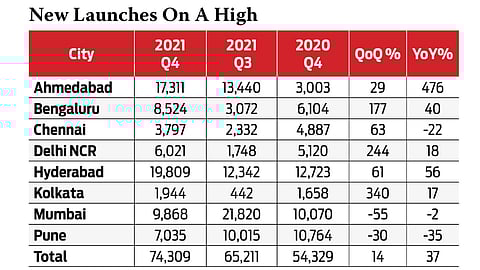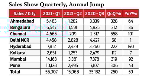 Sales of new housing units went up by nearly 60 per cent in eight cities, including Mumbai, Delhi NCR and Bengaluru in the three months between July and September 2021 as compared to the same period in the previous year, according to a recently released report. However, the overall year-on-year (y-o-y) jump in calendar 2021 was 13 per cent compared to 2020, says a report released by Prop Tiger, a real estate advisory firm, in February.