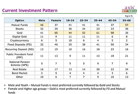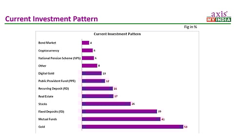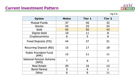 Pradeep Gupta, chairman and MD, Axis My India, said, "Gold has always enjoyed a cultural affinity with people and this survey reiterates how the yellow metal is a major part of our financial journey since time immemorial. Digital modes of investments are catching up and the metro cities have quite a high proportion of people who are investing in one form or the other."