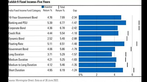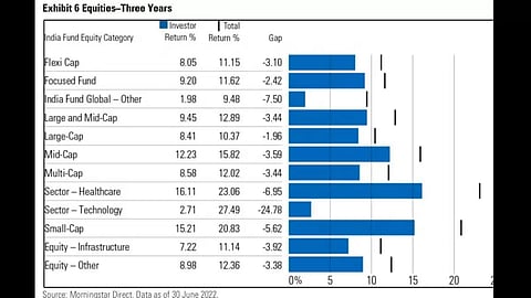 Investors earned about 7.8 per cent, 6.3 per cent, and 6.5 per cent per year on the average rupee they invested in mutual funds across various fund categories in the last three, five, and 10 years, respectively, as of June 30, 2022. This was almost 2.7 per cent, 2.5 per cent, and 5.8 per cent less than the total returns generated by the funds over the same duration, i.e., three, five, and 10 years, respectively.