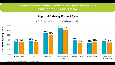 Two-wheeler loans saw an approval rate of 55 per cent in the three months ended March 2021, while in the three months ended March 2022, it was 51 per cent. Elsewhere, the auto loan category saw an approval rate of 44 per cent in the three months ended March 2021, while for the corresponding period ending March 2022, it was 40 per cent.