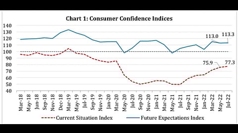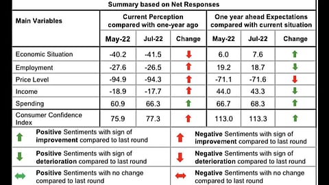 Though the consumer confidence index has improved and now stands at 77. 3, it is still in the negative territory, since consumers are still being pessimistic, the survey revealed. In May 2022, the consumer confidence index was 75.9. Index figures below 100 is considered to be in pessimistic territory, but if the index is above 100, it indicates optimism.