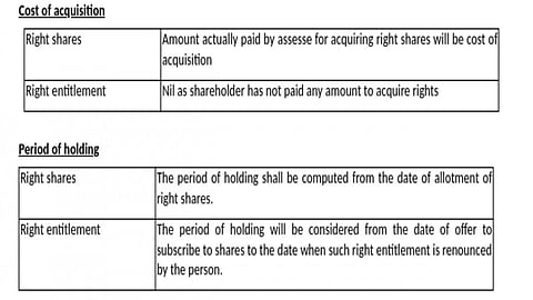 The following table explains how the cost of acquisition and period of holding differs in the case of exercising rights, i.e., buying the shares and renouncing, i.e., selling the right to purchase the shares in the market.