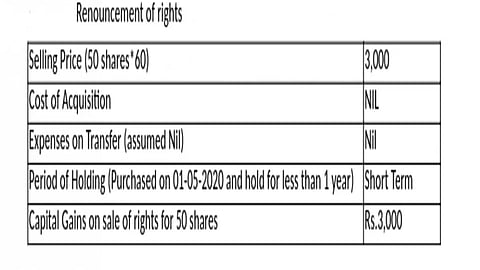 You sold your right to 50 shares at Rs 60 each. You got these rights from the company for free; hence, there is no acquisition cost, and since you got these rights in May and sold them in the same month, short-term capital gains tax will apply. Refer to the table below for a tabular representation.