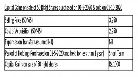 You received 100 shares in the rights issue, sold 50 rights (shown in the above example), and exercised your rights to buy the remaining 50 shares at Rs 45 each. So, when you sold your 50 shares, which you purchased in the rights issue at Rs 45 each, for Rs 65 in the market, you gained Rs 20 per share, which is your profit. Since you bought these 50 shares in May 2020 and sold them in October 2020, short-term capital gains tax will apply.