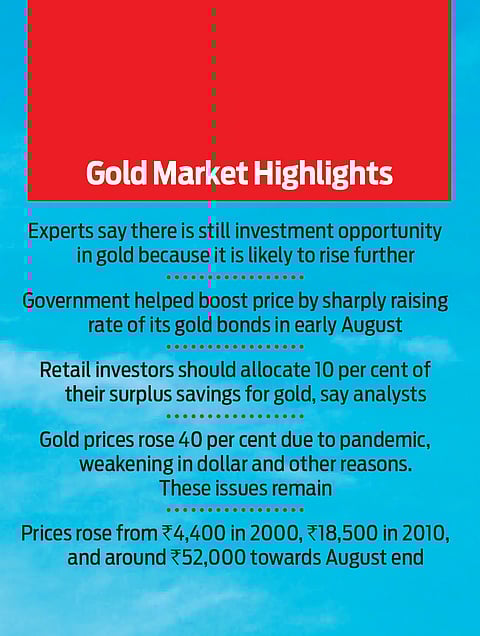 The price increase was a awesome 40 per cent offering huge opportunities for short-term profits until the prices began falling in the third week of August and the yellow metal losing more than `4,000 in value to reach `51,200 by August 25. And yet, the gold is rallying at a much higher level than it did a year back.