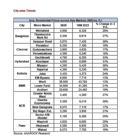 Driven by robust demand, the average residential prices in key micro markets across the top 7 cities in India have witnessed a significant surge in the last three years, between October 2020 and October 2023.