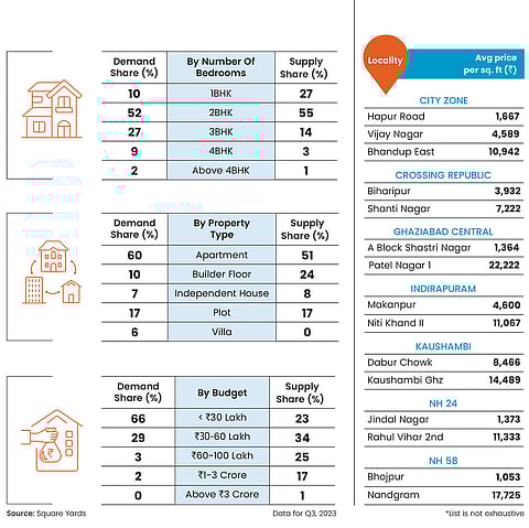 Ghaziabad’s property prices have escalated in the past few months, but it is still the most affordable in Delhi NCR. In Q3 2023, there have been 2,000 new launches led by Raj Nagar Extension with 800 units and Mehrauli with 463 units in the city.