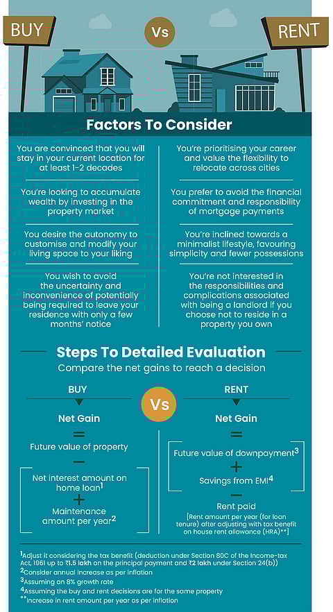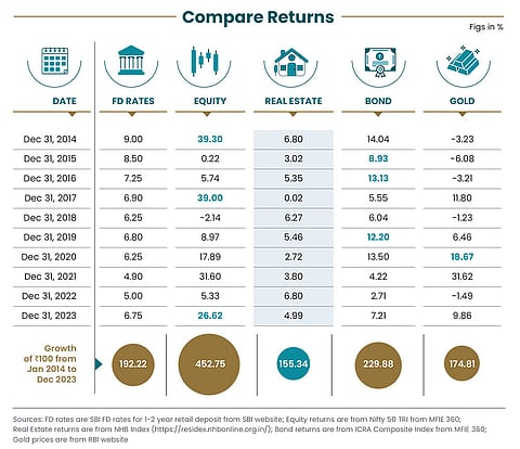 Most Indians buy homes not so much for investment, but rather for self-use, which incidentally should not be seen from the prism of investment. So, before you put your money in real estate, ask whether it is better to stay on rent or buy a home for yourself. And should you decide to invest in property, compare it with other options, such as fixed deposits, gold, bonds, and equity