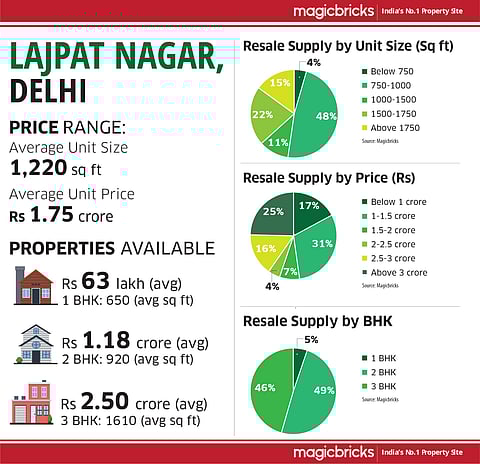 An established residential cum commercial neighbourhood in South Delhi, Lajpat Nagar is divided in four phases – I, II, III and IV. The area is surrounded by well-known South Delhi neighbourhoods like Defence Colony, South Extension, East of Kailash and Friends Colony. Most of the residential developments in the locality are builder floor apartments and independent houses, under Residents Welfare Association (RWA).