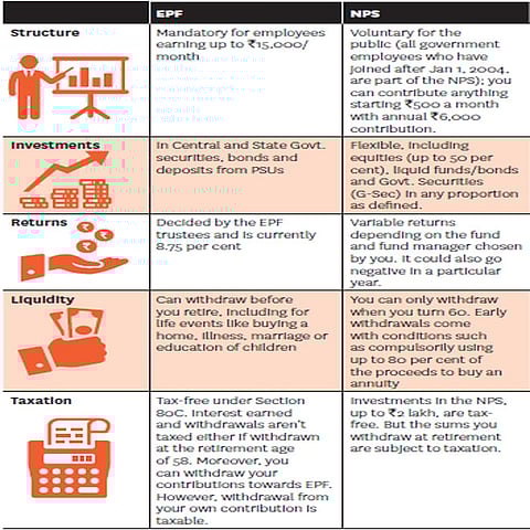 Here is a quick analysis of EPF and NPS on the lines of their structure, investments, returns, liquidity and taxation. This will enable you to make a smart choice between the two.