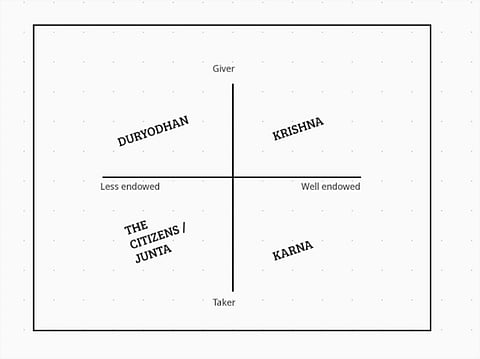 There are people in every social system, who are well endowed and less endowed. Then there are givers and takers. Less endowed takers (Aam junta, common citizens) are always asking for more and more and can seldom be satisfied. Well endowed takers (Duryodhan) are greedy and despite their wealth want more. Less endowed givers like Karna have the heart but are constrained by lack of resources. Well endowed givers like Krishna are considered God like.