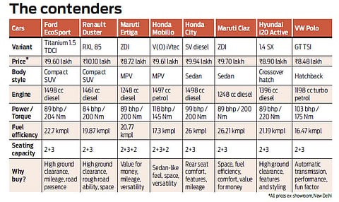 If you have a budget of about Rs.10 lakh for a car, you can be pretty spoilt for choice. Not only are there many brands to choose from, there are different body styles to pick as well. You can choose a compact SUV such as the Ford EcoSport or Renault Duster, an MPV such as the Maruti Ertiga or Honda Mobilio, a mid-size sedan like the Maruti Ciaz or Honda City or even crossovers and premium hatchbacks such as the Hyundai i20 Active or Volkswagen Polo GT.