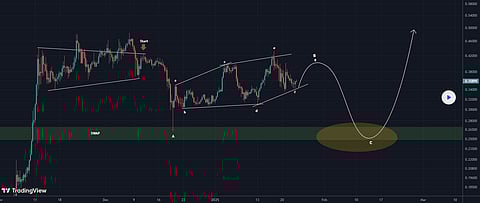 Once that happens, wave C is expected to pull the price lower, somewhere around the $0.26 level.